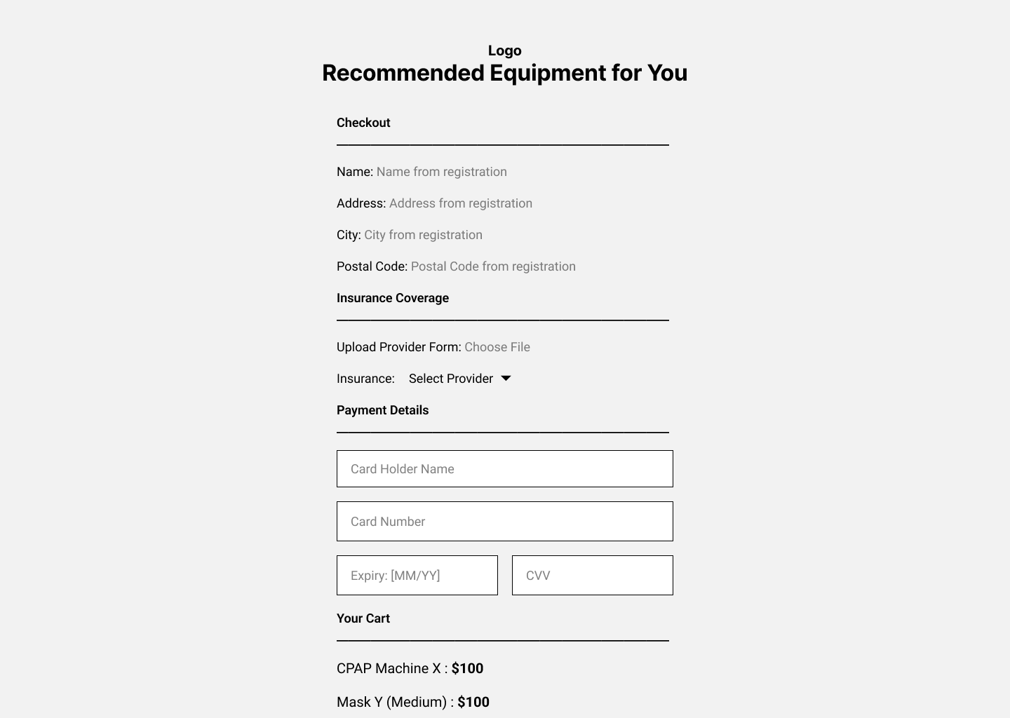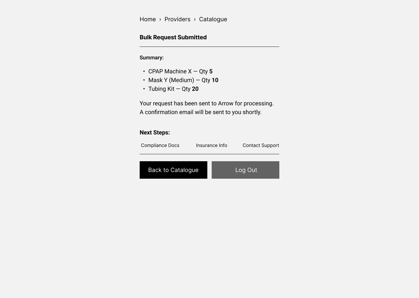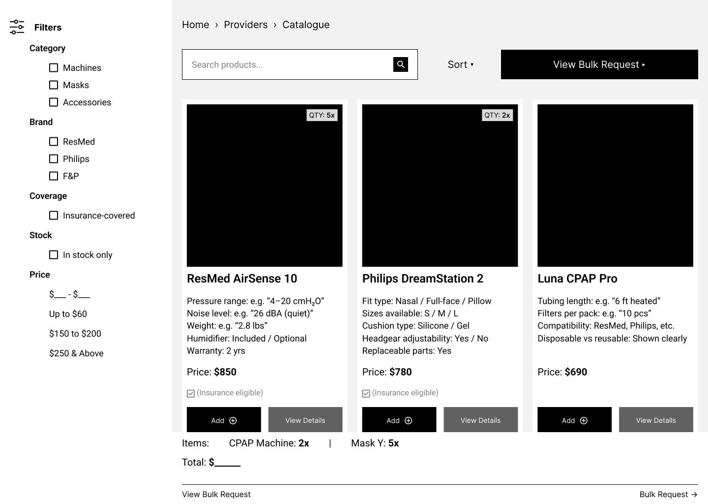 Wireframe of the provider catalogue flow, designed to streamline equipment browsing and make compliance documents easier to access.