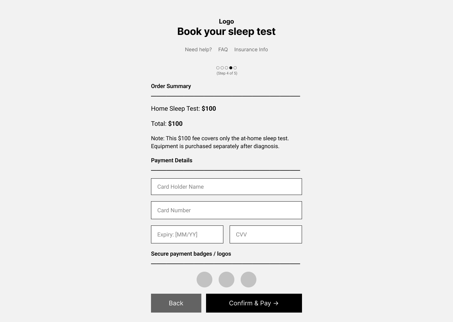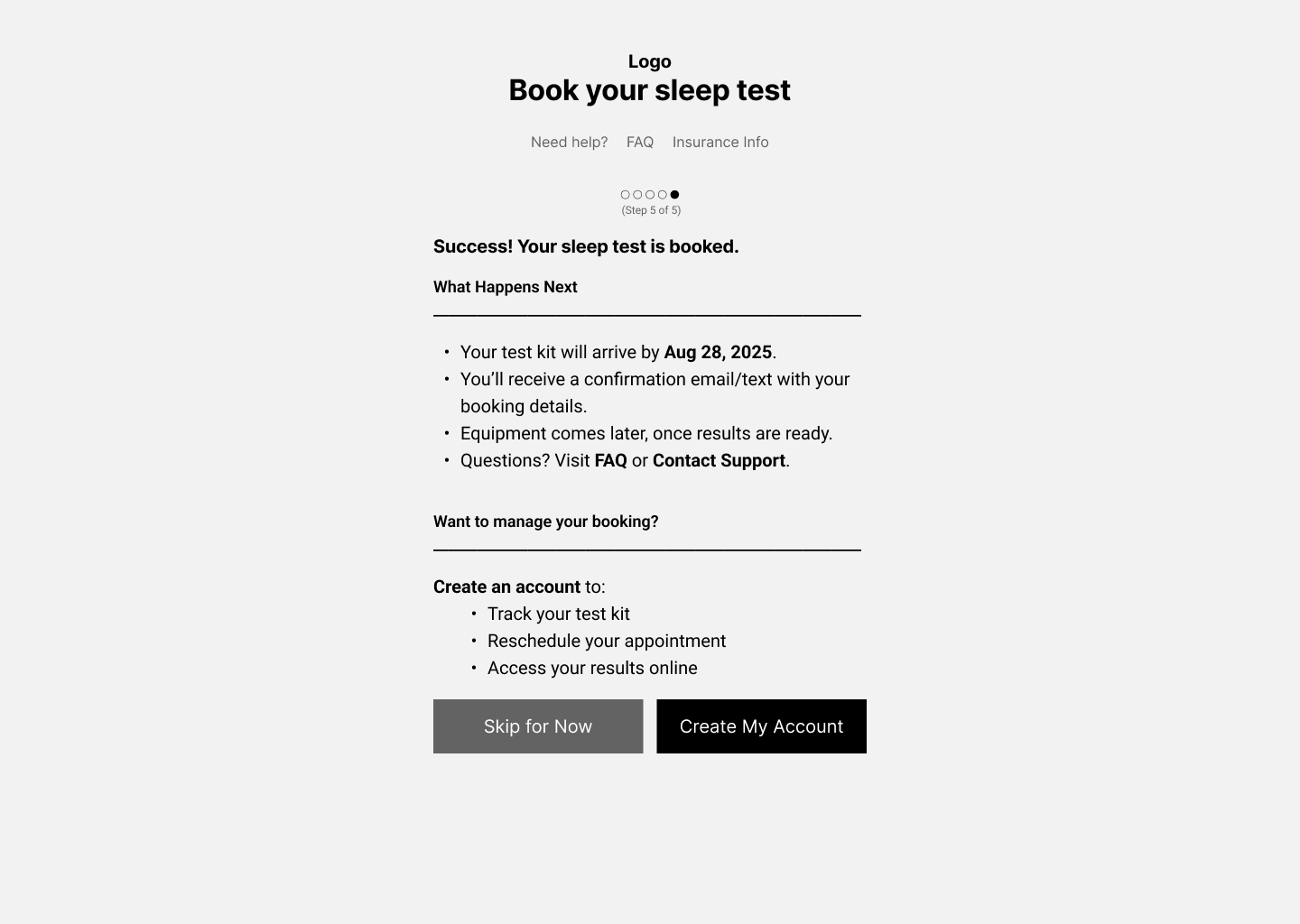 Wireframe of the patient sleep test booking flow, exploring how to simplify steps and improve accessibility